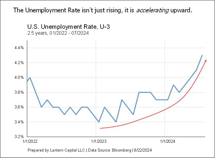 While there seems to be more Fed cutting priced into the market than fits with the current environment, the lesson from past recessions is that it doesn’t matter; the bond market prices in much more weakness than is visible because it expects a recession ahead. Also, the more recessions that occur with these regularities, the faster the market expects them. It did this wrongly last May (after the banks failed) and December (red circles in chart above), but that was before the Unemployment Rate had risen 0.9% and was accelerating upwards (see chart below.) While most other economic indicators have a less direct implication for the economy, the Unemployment Rate is broadly inversely proportional to GDP growth, enshrined with Okun’s Law. This is logical because as unemployment rises, fewer people have incomes, and consumer spending (68% of the economy) is impacted negatively.