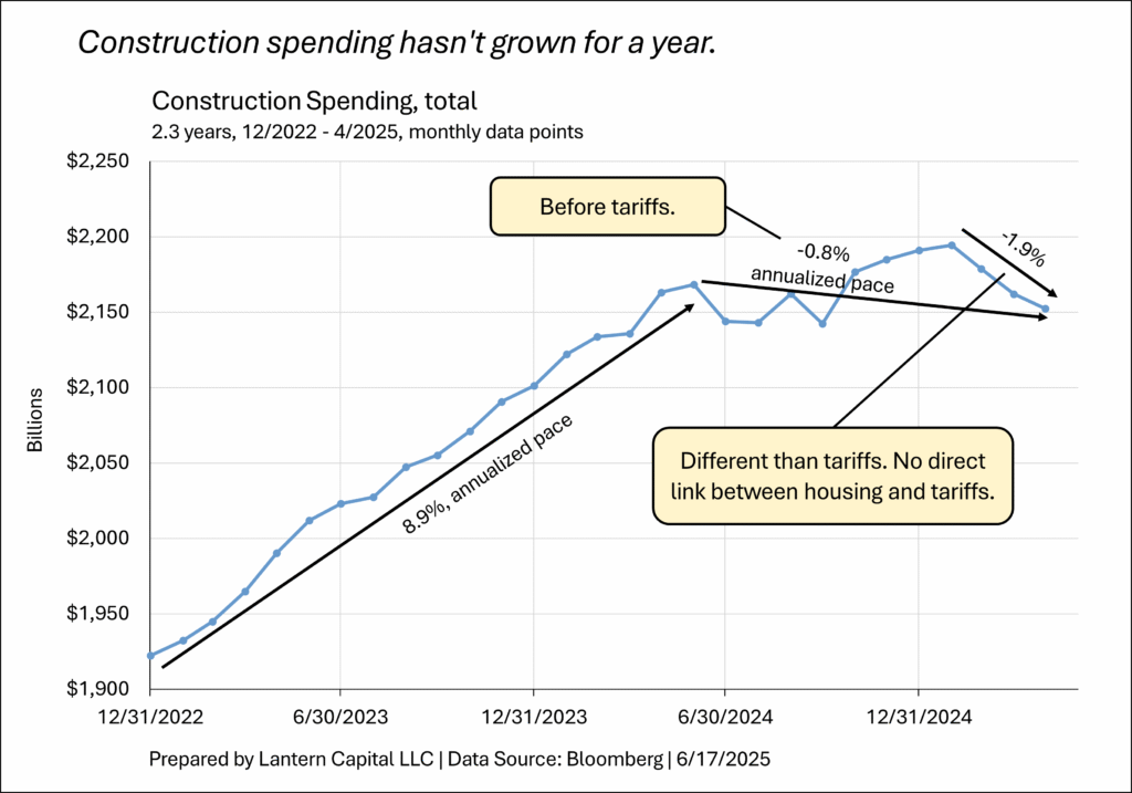 4. Housing has emerged as a point of acute weakness in the last few months across all housing indicators. One of them, construction spending, has fallen 1.9% over the last four months and is down -0.8% annualized over the last 11 months. There isn’t a clear link between tariffs and housing and the trend flattened about a year ago.