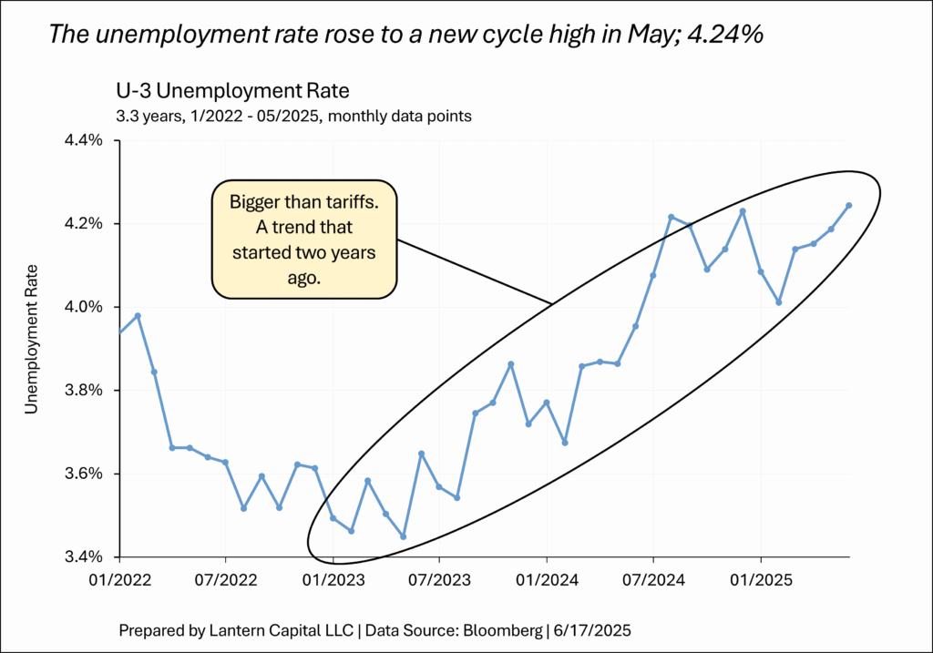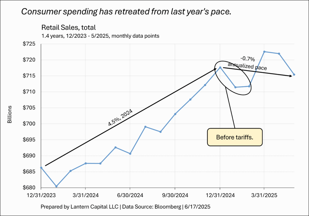 With the stock market recovering most of what it lost earlier this year and tariffs coming down from the scary levels of Liberation Day, the consensus thinking is that the past few months were just another recession scare like 12/2023 or 08/2024, it was only about tariffs, and the economy will forge ahead. But the economy has been deteriorating for years ahead of tariffs and new evidence of economic weakness not necessarily related to them is springing up; housing, low inflation, consumer spending, and labor. The following seven charts show economic weakness contrary, bigger, before, or different than the tariff effect — a reminder that the business cycle continues to move forward towards a recession and the economy is far from “solid.”