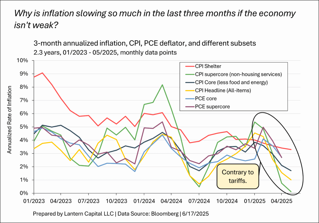 3. Inflation rates have fallen in the last three months. Tariffs are inflationary and their biggest effect is thought by most economists to be ahead, but why have inflation rates fallen so much recently if the economy isn’t weak? Both services and goods are flat or falling over the last three months contrary to the tariff effect. On a 3-month annualized basis, core goods (goods ex. food), the group being watched most closely for tariff effects, have deflated -0.3%. Core services have been essentially flat at +0.1% and all items have risen just 1.0%.