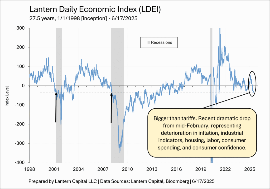 1. The Lantern Daily Economic Index (LDEI), which summarizes the “totality of the data” in real-time and now on the Bloomberg Terminal at LTRNLDEI <Index>, has fallen dramatically since February 14th, well before tariffs could be reflected in the data, and now to levels associated with the start of recessions in 2001 or 2007. Several of the elements within the index are shown in greater detail below, but the comprehensive LDEI illustrates that the economy is weakening overall.