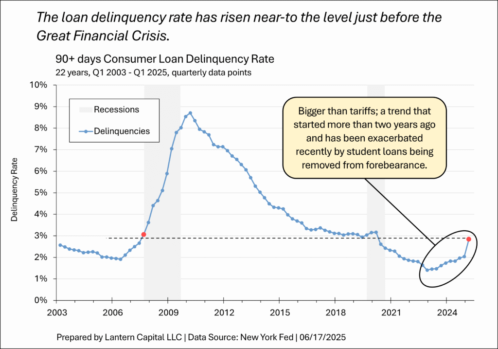 5. Consumer loan delinquencies are at recessionary levels. After the Trump administration removed student loans from a long forbearance period in place since the COVID-19 era, overall loan delinquencies are now near the level that they were just before the Great Financial Crisis. Surprisingly, student loan delinquencies are at about the same level now as they were back in 2007, but credit cards and auto loans which are just a fraction of the amount outstanding compared to mortgages (22.1%), have enough delinquencies such that the overall level is akin to the Q3 2007 mortgage crisis. The trend upwards began in 2023, more than two years ago.