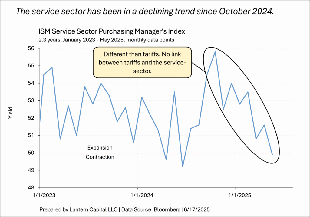 7. The ISM service sector PMI has been in a declining trend since last October to now contracting in May. The service-sector, by definition, is not part of the tariff affected goods sector.