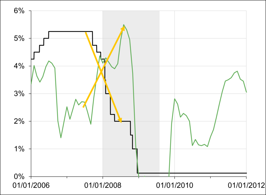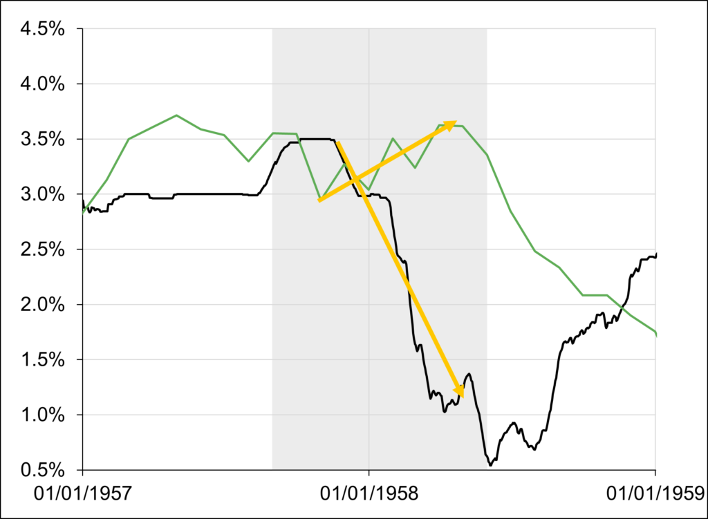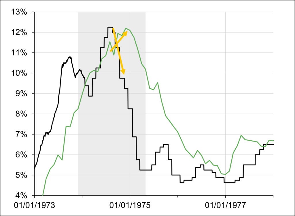 In the following charts, the black line is the Fed Funds rate and the green line is the year-over-year CPI (Consumer Price Index, inflation). Gray bars denote recessions. The crossing gold arrows show the Fed lowering rates amid rising inflation.