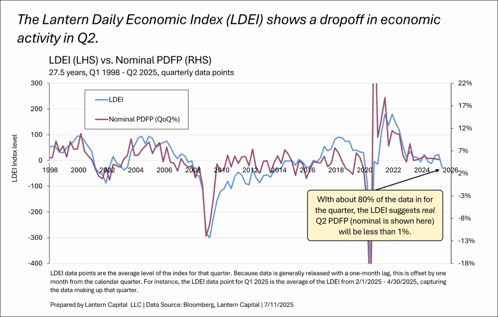 PDFP helps reconcile the large downturn in the Lantern Daily Economic Index (and other monthly composite indicators such as the Conference Board’s Coincident Indicators Index or S&P monthly GDP) over the last few months. The LDEI is well correlated to nominal PDFP (chart below). With about 80% of the economic data released for the second quarter, the LDEI suggests PDFP will be less than 1%.