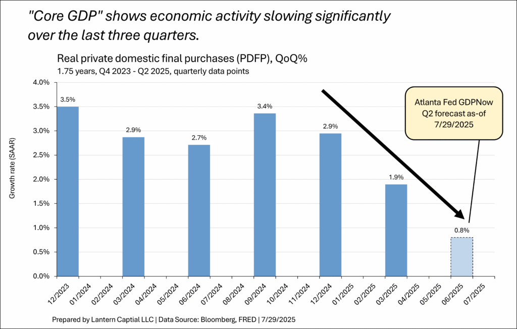 1. PDFP. Jerome Powell frequently mentions private domestic final purchases (PDFP) in press conferences as the Fed’s preferred signal within the GDP report. PDFP excludes foreign trade, government activity, and inventory investment; isolating private domestic demand which is the part economists are most concerned about falling in a recession. This measure is closer to the 6 monthly indicators the NBER uses to date recessions, the LDEI, and the Conference Board’s coincident indicator index which have all shown recent weakness. Positive PDFP was crucial to seeing that the US economy wasn’t in a recession in the first half of 2022 when Q1 and Q2 headline GDP were consecutively negative and was important earlier this year to seeing that headline GDP understated growth because of tariff pre-buying activity. Think of it as “core GDP”. Powell mentioned it in four of the last eight FOMC meetings: