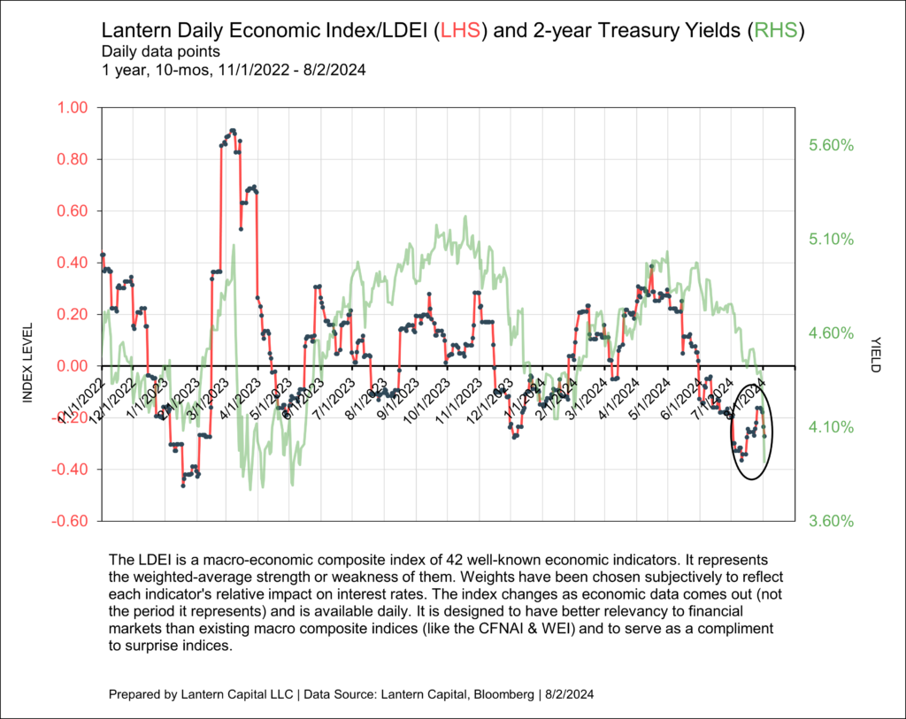 I’ve been wrong with my short-term call in the last two weeks, thinking that interest rates would move higher surrounding the Fed. They have fallen dramatically. Economic data this week has been negative (ISM, Initial Jobless claims, and Unemployment/payrolls.) That, combined with the Fed’s 2nd pivot on Wednesday, the stock market falling continually, and the Sahm rule being triggered today, has caused the market to price-in a lot of Fed easing with a low 2-year yield.