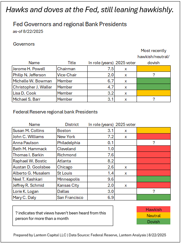 I’m sure weaker economic data is coming given the point in the business cycle, but two months of stronger consumer spending, higher services inflation, and a hot PPI are tilting the overall Fed hawkish for now. Of the 11 voters on the FOMC, by my assessment, there are two doves, three neutral, four hawks, and two unknowns (table below). Of the whole group (18 Governors and regional bank Presidents), there are four doves, three neutral, seven hawks, and four unknowns — still a lot of red. Powell’s intention today was not to lean one way or the other, but to strike a compromise between hawks and doves.