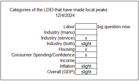 1. The service sector PMI (purchasing manager’s index) from the Institute of Supply Management was released this morning, falling almost 4 points from its last reading to 52.1 from 56.0. The service sector component of the Lantern Daily Economic Index (LDEI) was the biggest contributor of its rise from 8/1/2024 – 11/13/2024, and I’ve been watching these indicators for a sign of weakness. It came today. From mostly this, the LDEI dropped 0.11 today which is significant (see chart below.)