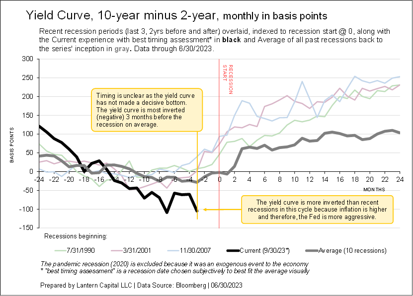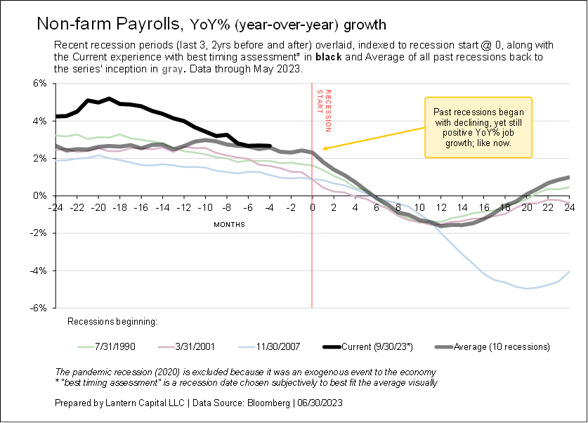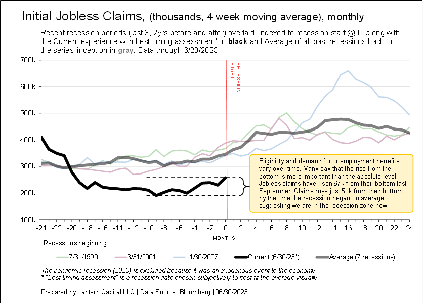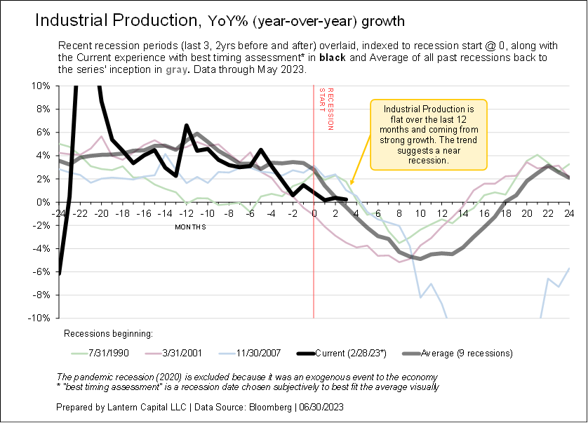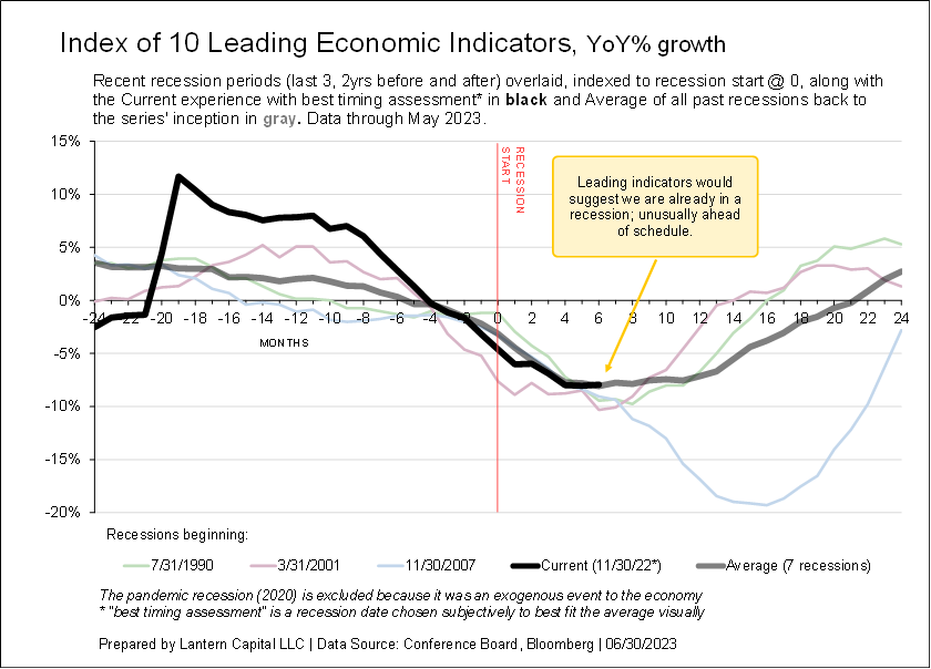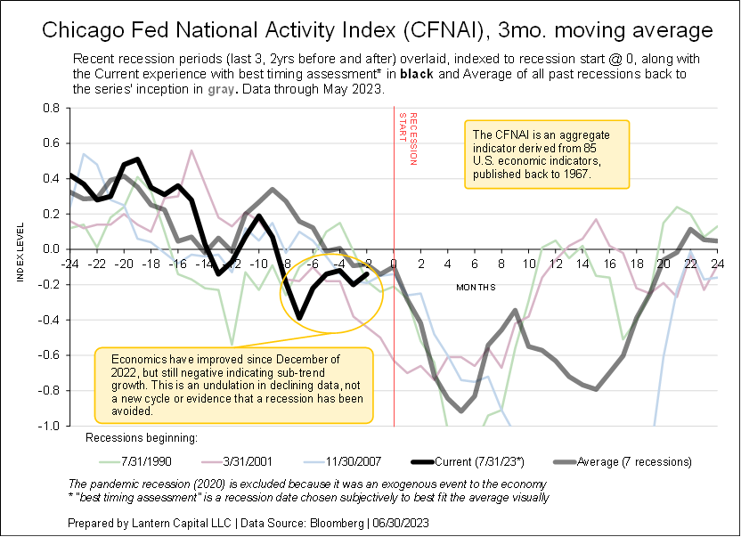 The charts show an economic indicator’s behavior 2-years before and after past recessions indexed to its relevant recession start date and overlaid. The last three recessions (ex. 2020 COVID) are shown along with the long-term average and current series. Start by comparing the thick black line to the thick gray line. The intention is to show that a range of economic data is slowly weakening and near-to or beyond levels consistent with the beginning of a recession. The financial media and Fed is hoping for no recession, but behind the scenes, and at a longer-term data precision (“economic time”), data is slowly deteriorating towards a recession.