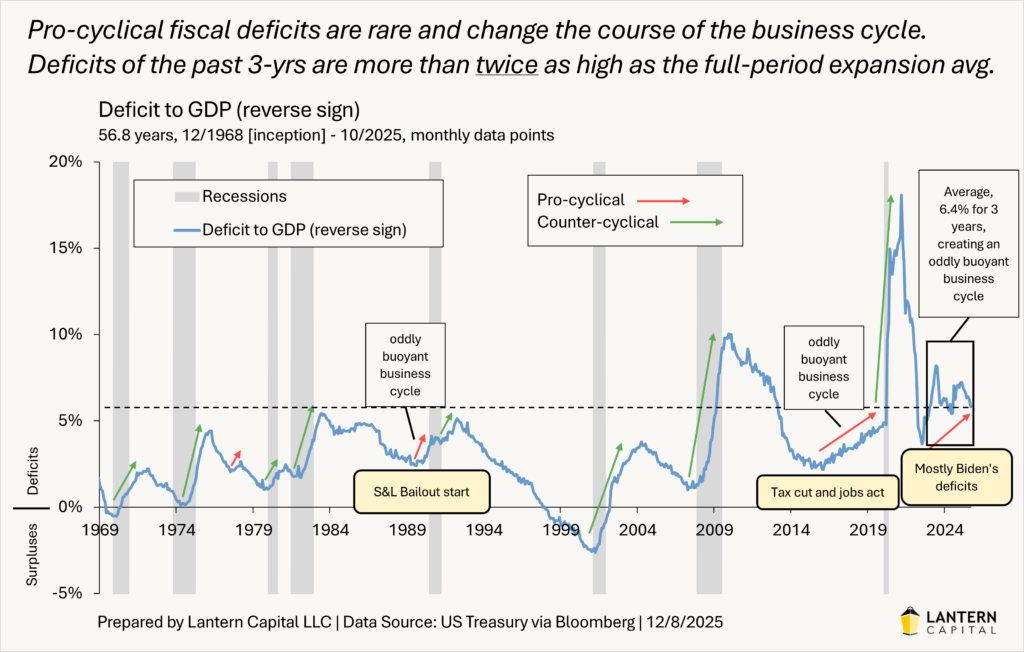 Fiscal deficits keep the economy more buoyant than would otherwise be the case and are the most logical reason why the economy has remained in a state of purgatory at the top of this business cycle. The deficit is important to re-acknowledge because of how massive it is (biggest pro-cyclical deficit since WWII), how long it has been this way in an expansion (three years), and because it isn’t going away. It is expected to remain around 6% of GDP in 2026 with several fiscal elements of the One Big Beautiful Bill Act taking effect in January.