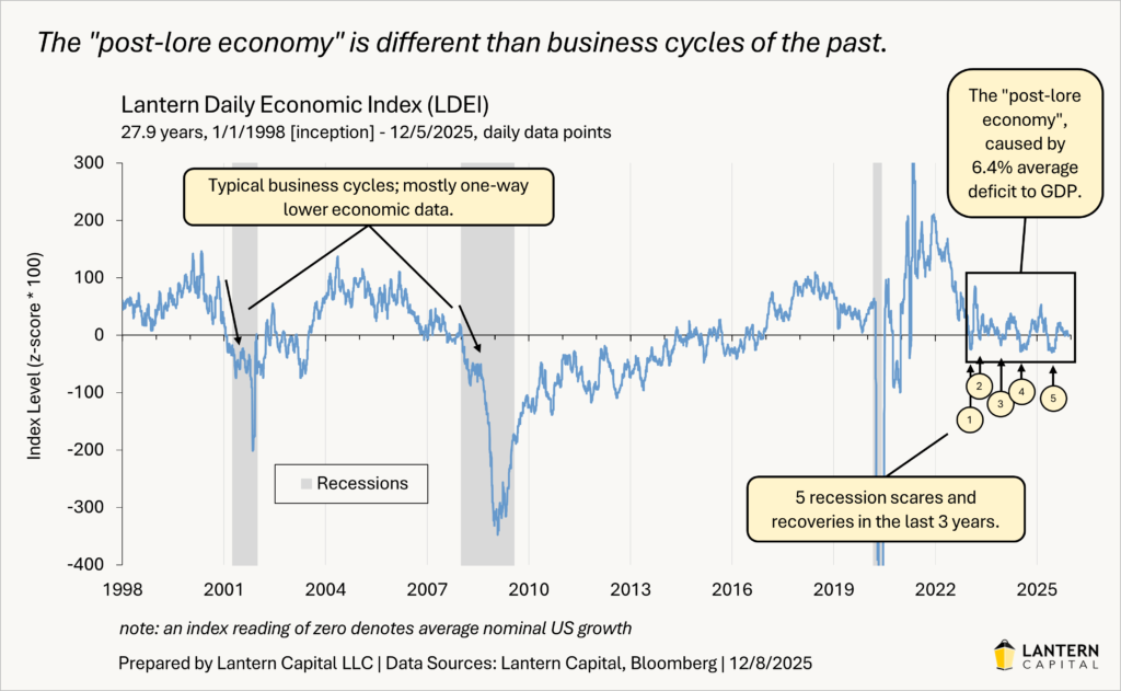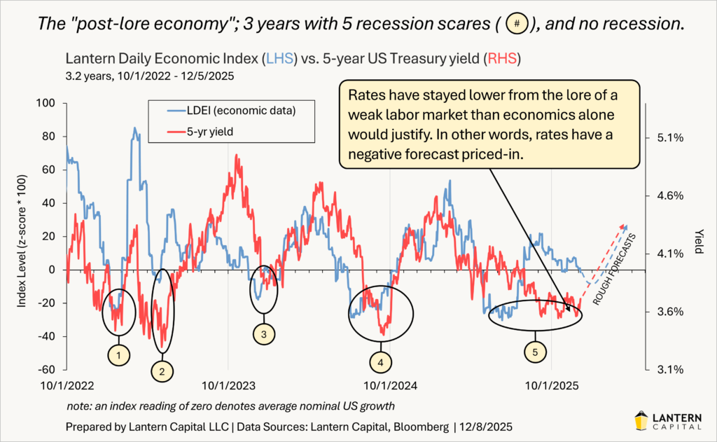 Because of the three-year deficit-suspended wave pattern and nothing to interrupt it, the economy having already recovered, and low stimulative Treasury yields, I expect this “post-lore economy” will continue with more solid economic growth, a labor market recovery like after the Fed cut rates last year, a paused Fed, and significantly higher Treasury yields. Barring event risk, the economy will only turn back around again negatively once Treasury yields have risen enough to restrict it. To summarize Lantern’s U.S. Treasury yield call: