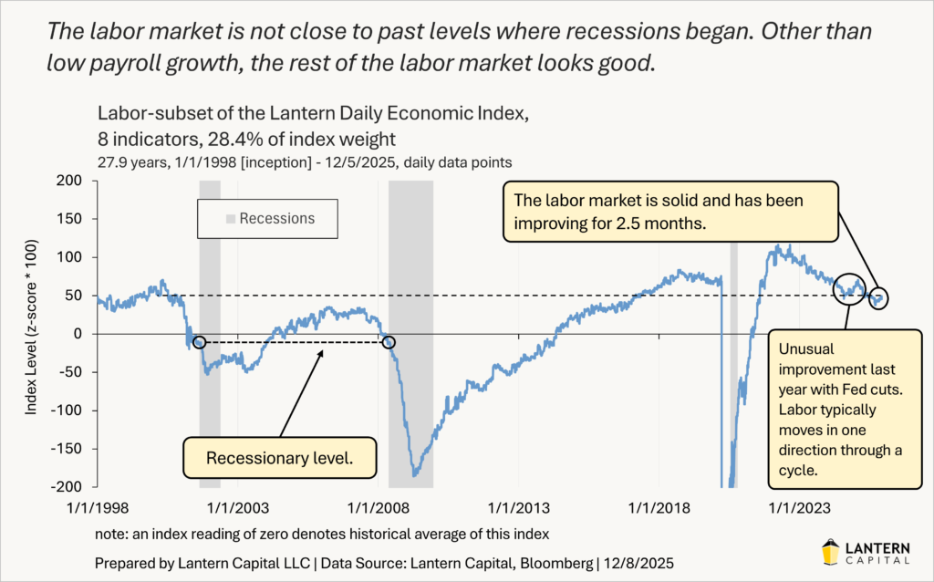 For three reasons, low payroll growth will become the fifth false alarm. First, by the LDEI or GDP expectations, the overall economy has already recovered from the wave of depressed economics in the spring and sustained it for four months [6]. In other words, to answer Jerome Powell’s quote above, the stronger growth we’re seeing is real. Consumer spending less inflation (69% of economy) rose 2.7% annualized in Q3 and Chicago Fed CARTS data suggests it has risen another 1.8% annualized through 2/3rds of Q4. Note: economists expect Q4 to be temporarily soft because of the government shutdown. Industrial indicators have risen since mid-June [7] and housing indicators have risen since late September [8]. The Beige Book, the Fed’s semi-quarterly report on anecdotal assessments of business activity, has shown an improving economy too with less of the economy in recession over the last three months [9]. The economy is doing well.