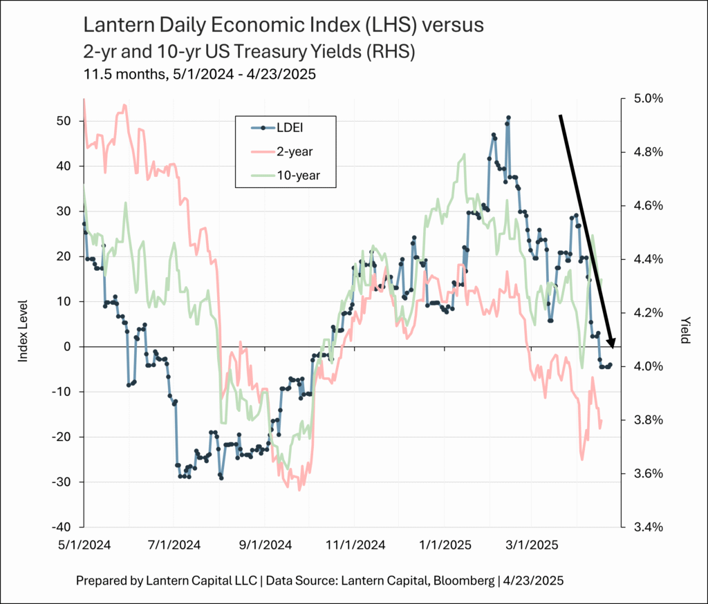Economic data still needs to weaken a little bit more (labor particularly) to get more of the Fed to talk and act dovishly (Waller already is), but everything is headed in that direction. The LDEI is in a clear trend lower since mid-February (black arrow in chart below) and I expect that to continue.