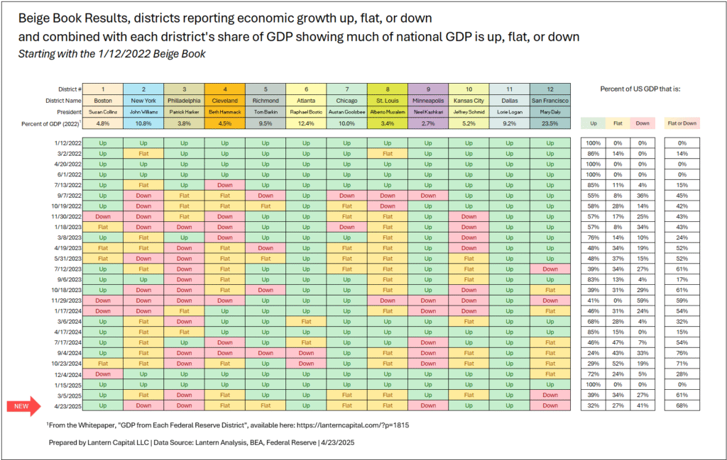 The latest Beige Book, a collection of anecdotal information from the twelve Federal Reserve Districts was released today. I combine which districts are characterized up, flat, or down with the amount of GDP per district from my whitepaper last year to come up with the Percentage of US GDP in recession. This figure increased to 41% from 27% before (see chart below.) In addition to the Philadelphia and San Francisco districts receding in the last Beige Book, the New York (10.8% of US GDP) and Minneapolis (2.7% of US GDP) districts are receding now too.