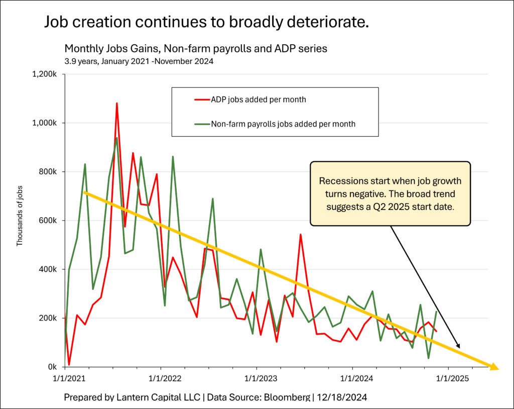 The Fed was hawkish today causing the 2-year to rise 13 basis points, but this tone and economic projections are entirely based on the “mini-boom” that’s occurred since August which is not durable. Powell made this distinction in an answer to a question about the Summary of Economic Projections showing just two cuts next year, “I think the actual cuts we make next year will not be because of anything we wrote down today. We are going to react to data, it is just the general sense of what the committee thinks is likely to be appropriate.”