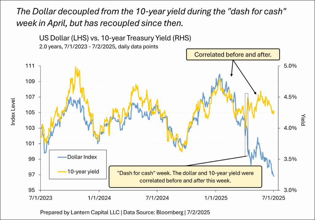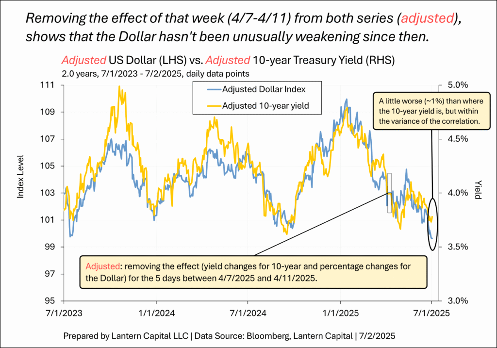 On Monday, April 14th, 2025, I wrote a piece “What happened last week”, chronicling a strange week the week before (4/7-4/11) for the Treasury market and Dollar which was reminiscent of a period from COVID-19 (March 2020) where investors sold Treasuries and the Dollar simultaneously, something worse than the normal reaction in times of stress that benefit Treasuries and the Dollar (flight-to-quality). This most recent period happened right as the Trump Administration raised tariff levels to their highest levels of 28% (effective tariff rate, Yale Budget Lab.) The world was scared enough of what this would do the global economy, that cash was favored over Treasuries and domestic currencies over the Dollar. I call it the “dash for cash” week. During that week, the Dollar fell 2.8% and the 10-year Treasury yield rose 50 basis points. Since then, the Dollar has fallen further (-3.3%) but so have 10-year Treasury yields (-21 basis points), their typical correlation. The charts below show the Dollar versus the 10-year yield (first chart) and what those series look like by removing the effect of the “dash for cash” week (second chart); pretty well correlated.