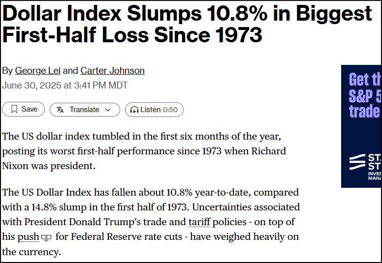 News stories abounded in the last two days reporting that the US Dollar (DXY index) had the worst first half since 1973. See examples below: