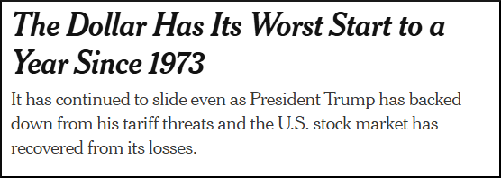 It is a popular topic. All these articles explain this is because of the Trump Administration’s trade and fiscal policies and attacks on the Fed’s independence, but they leave out that that the 10-year Treasury yield has fallen about 50 basis points from its mid-January high which naturally weakens the Dollar. This yield drop doesn’t explain how much the Dollar has fallen (more below) but the Dollar is naturally correlated to Treasury yields because higher interest begets more investment and vice-versa. Across the political spectrum, many want the Dollar’s narrative to be about the Trump Administration as a rebuke to its policies, but it only decoupled from the 10-year Treasury yield for one week and has been well-correlated before and since. The Dollar hasn’t made back what it lost in that week, but it isn’t getting any worse. Recent declines in the Dollar mostly reflect that interest rates have fallen.